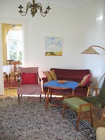 På nedanvåningen finns toalett med dusch, tvättstuga med tvättmaskin och modernt utrustat kök. Det finns två vardagsrum, samt hall och veranda. Egen uteplats och grill och liten trädgård och gemensam trädgård med oss.
